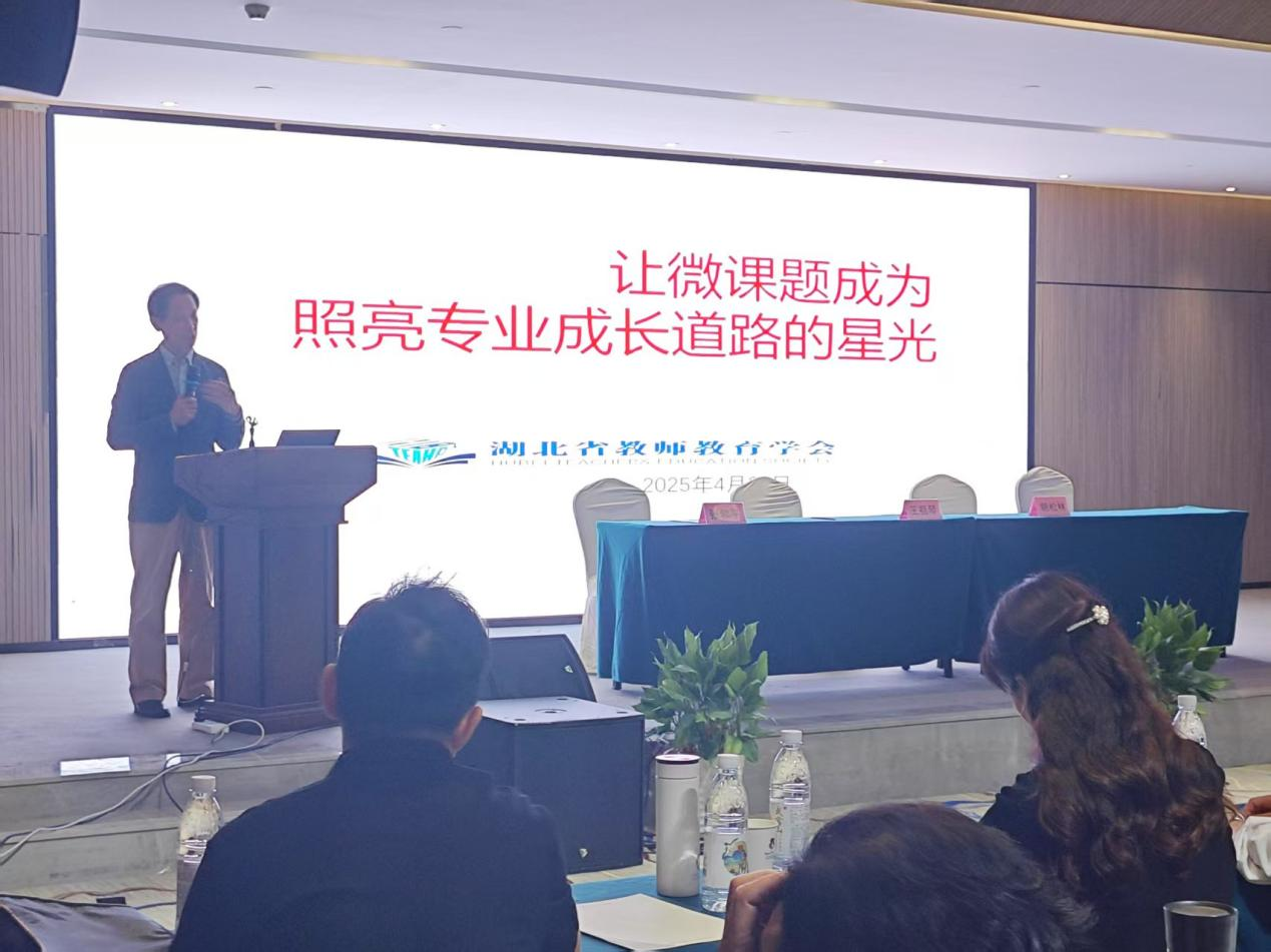 随后,湖北省教师教育学会常务副会长胡松林做了题为“以微光照亮教育实践之路--中小学教师微型课题研究实操指导”的主题报告,他以“微光”为喻,深入剖析了微课题研究的本质特征与技术路径。胡会长指出当前微课题研究存在“贪大求全、穿靴戴帽、炒作概念”等误区,亟需从宏大叙事转向精微聚焦。通过对比大型课题与微型课题的差异,他提出“缩小外延、单点突破”的核心策略,并强调研究需“从流程迷宫走向架构升维”,简化程序、注重实效。胡会长还系统梳理了课题研究的认知误区,如“研而不做”“做而不研”“急功近利”等,呼吁教师回归研究本质。在实操层面,他分享了创新选题思路与设计要素:从问题溯源、任务拆解到行动方案制定,强调用数据验证成果、以普适性推广经验。针对研究质量,他提出“规范课题名称逻辑”“精准设定研究目标”“严谨界定概念内涵”三大要点,并以案例说明如何通过系统建构赋能教师专业发展。最后,他倡导教师成为“教学工具开发者”“教育经验提炼者”和“教研生态共建者”,鼓励教师多读书、多写作,实现从经验积累到理论升华的跨越。报告结束后,湖北省特级教师、荆州市实验小学正高级教师高良琴分享了心得体会及开展微课题研究的经历及感悟。