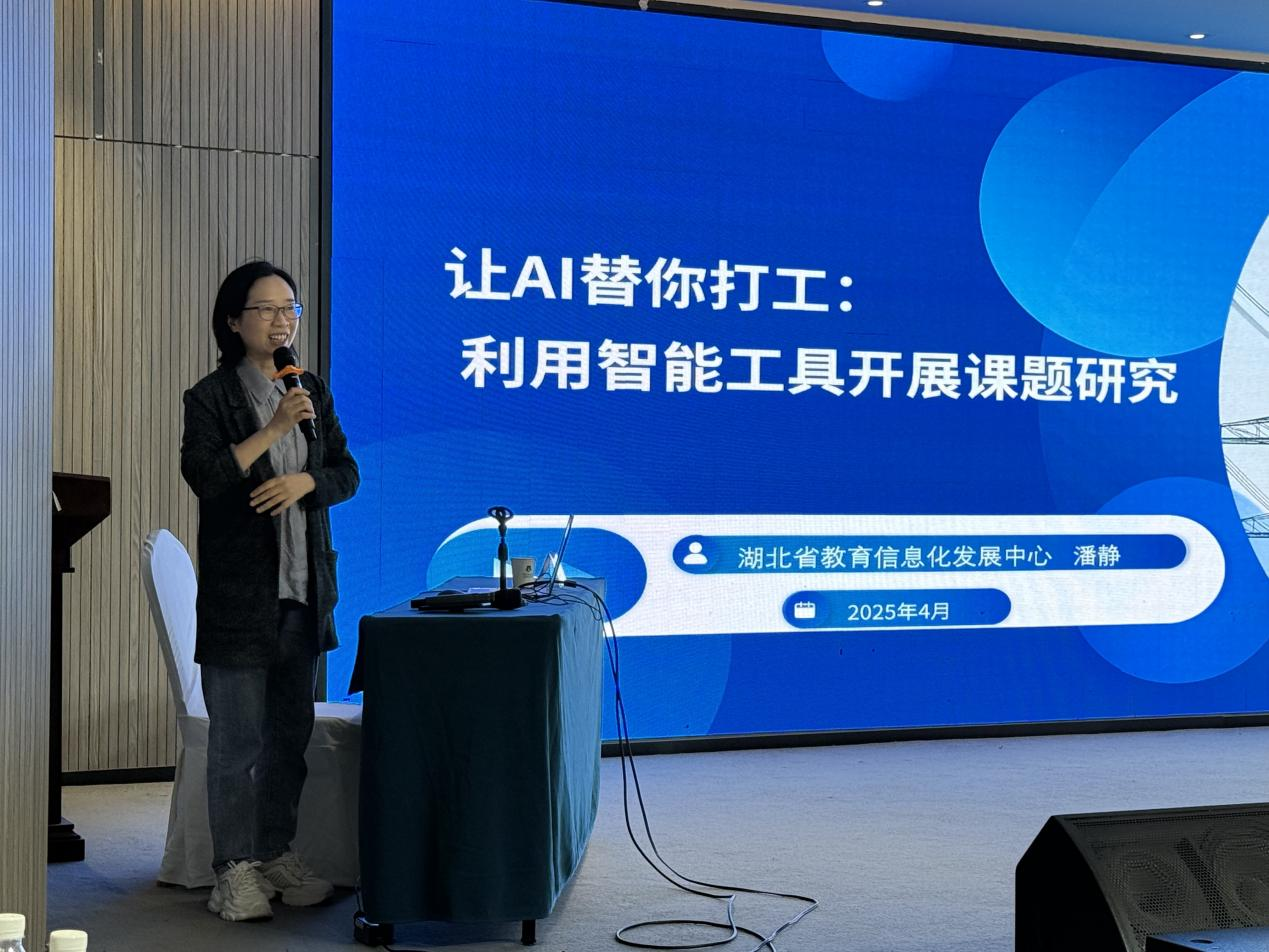 湖北省教育信息化发展中心技术服务部部长潘静以《AI为课题研究赋能》为题做了专题讲座,探讨了技术工具与科研能力的辩证关系。她指出AI技术虽能提升文献检索、数据分析效率,但无法替代科研思维与学术训练。在选题阶段,教师可利用国家社科文献中心、百度学术等平台进行热点分析,结合“课题申报指南”筛选研究方向;在文献综述环节,借助DeepSeek、讯飞星火等工具快速梳理研究脉络,但仍需人工校验逻辑和分析深度。潘静部长通过现场演示,展示了AI在关键词优化、论文大纲梳理、文献综述撰写和参考文献管理等方面的具体应用,并与参会教师互动答疑。她强调技术赋能的核心在于“辅助而非主导”,研究者需坚守学术底线,避免陷入“数据依赖”陷阱。她呼吁教师主动拥抱技术变革,将AI作为拓展研究视野的“瞭望镜”,而非替代独立思考的“捷径”。